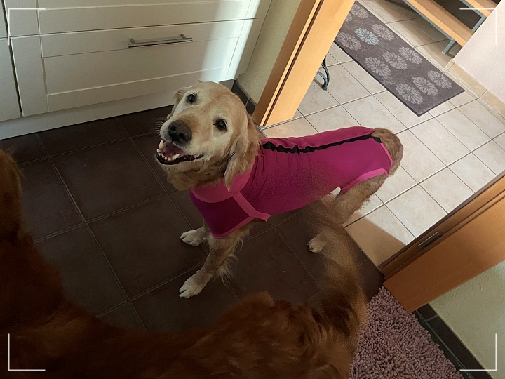 Das mein Mädchen mich ganz schnell wieder so anstrahlt. Es ist unglaublich, wie schnell Hunde solche OPs wegstecken. Wenn es nach Hetty ginge, wäre sie gestern schon wieder mit ins Training gekommen. Natürlich war sie brav zu Hause. Bis Freitag darf sie noch ihren stylischen Body tragen, dann werden die Fäden gezogen. Sie ist eine sehr brave Patientin.