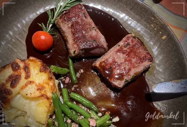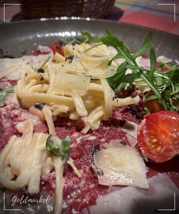Carpaccio mit Trüffel-Linguine und Lammrücken mit Kartoffelgratin und Böhnchen