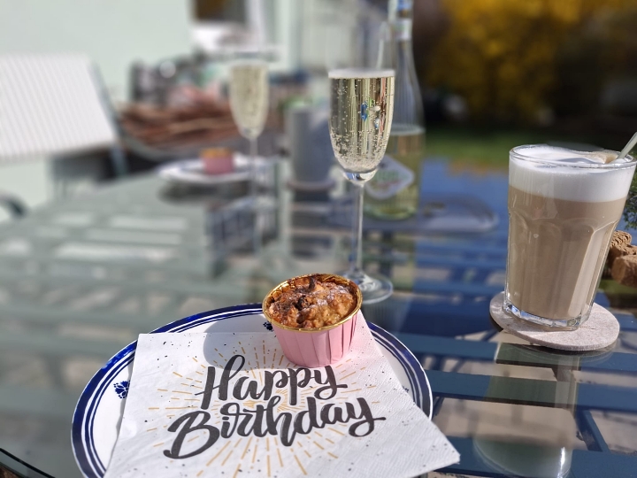 Der Geburtstag der besten Freundin wurde gefeiert. Wie jedes Jahr mit einem Spaziergang und anschließender Geschenkübergabe. Diesmal saßen wir bei uns auf der Terrasse und haben uns neben Kaffee auch eine Flasche Hugo gegönnt. Natürlich alkoholfrei *hicks