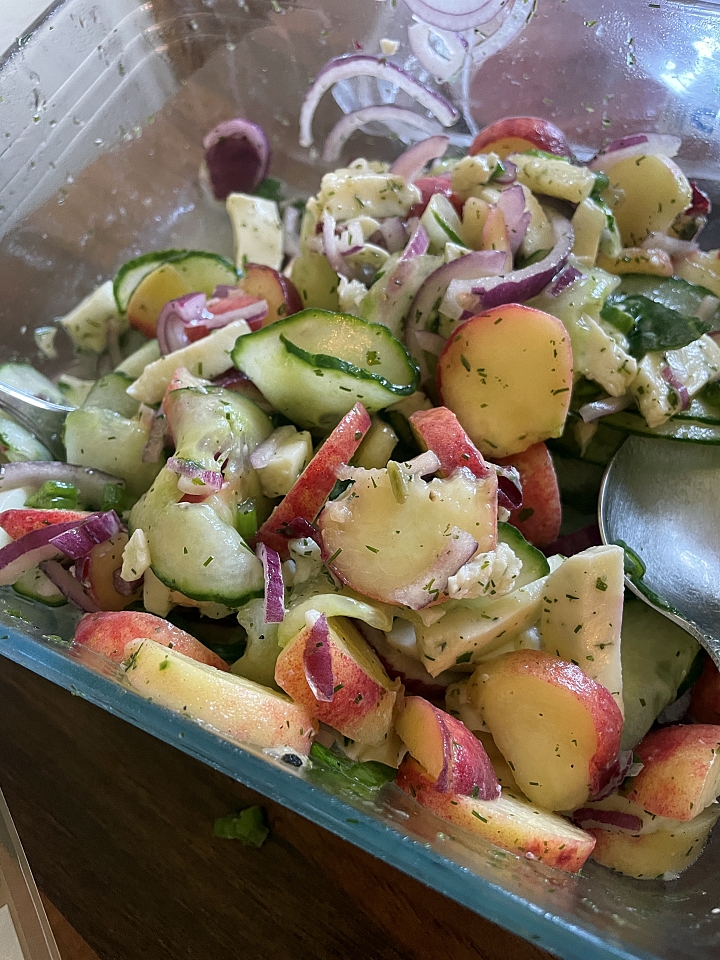 Gurken-Pfirsich-Feta Salat, Käsekuchen (ohne Zucker, ohne Mehl), Hühnchen mit Blattsalat und andere Leckereien.