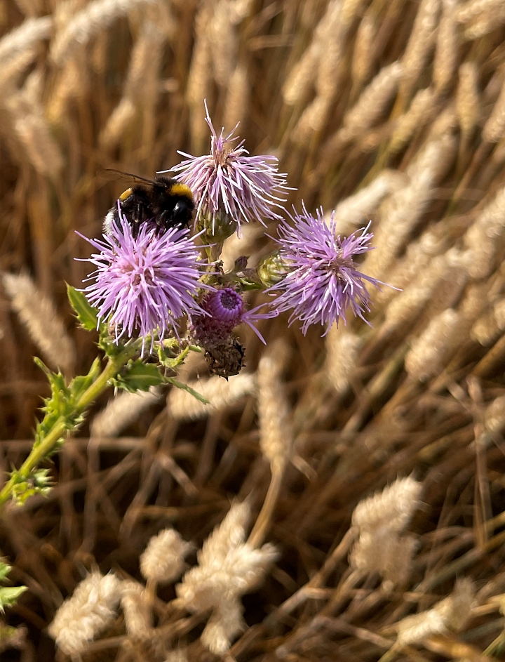 Eindeutig das gold der Felder. Hier schon abgeerntet bzw. als Hintergrund für die Diestel mit ihrem Gast.