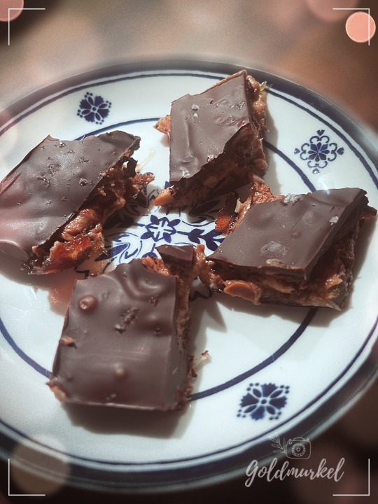Die entstandene Platte legt man in eine Auflaufform und bestreicht sie mit einem Aufstrich seiner Wahl. Erdnussbutter, Mandelmus, Cashewmus – einfach, was einem am besten schmeckt. Passend zum Aufstrich kann man dann noch einige Nüsse rösten, hacken und auf der Platte verstreuen. Den Abschuss macht geschmolzene Zartbitterschokolade und ein paar Flöckchen Fleur de Sel. Dann alles eine Weile ab in den Kühlschrank und fertig ist die Leckerei.