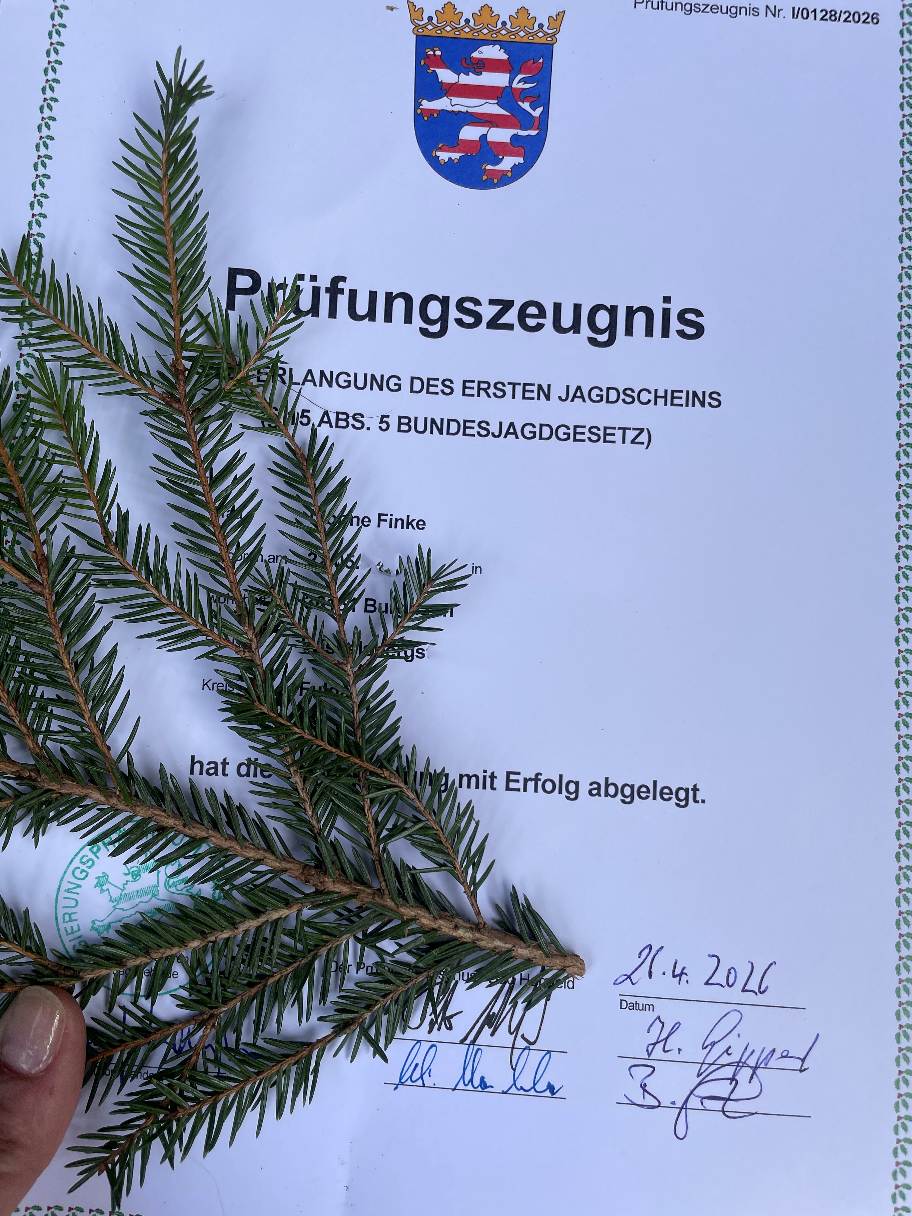 Jetzt, ein paar Tage später, bin ich immer noch sehr stolz und freue mich, dass ich es geschafft habe. Als Nächstes darf ich dann meinen Jagdschein bei der unteren Jagdbehörde lösen (Dienstag).