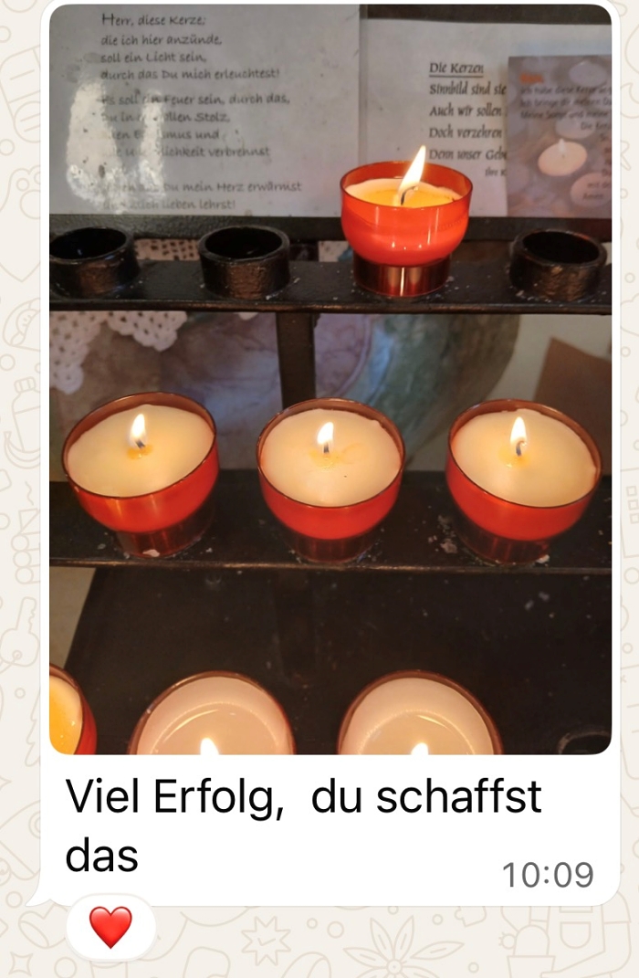 Am Sonntag nach der schriftlichen Prüfung musste ich dann meine Ehrenrunde auf dem Schießstand geben. Ich war so erleichtert… drei Mädels aus dem Kurs kamen mit, um mich moralisch zu unterstützen. Die Jungs aus der Lerngruppe hielten ebenfalls die Daumen und sogar der liebe Gott wurde eingeschaltet, da einer der Jungs in der Kirche ein Kerzchen für mich anzündete. Auch von Julia aus der Lerngruppe gab es ein „Glückslicht“