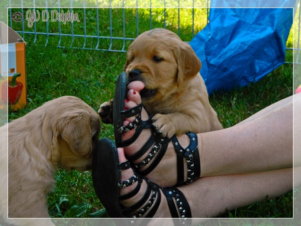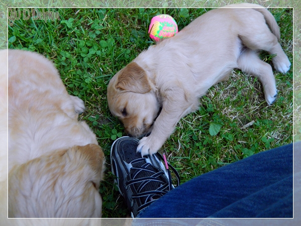 Aber nicht nur mit Kleidern lässt sich gut spielen, sondern auch mit Hosenbeinen, Schuhen, Schnürsenkel… sprich, alles was sich in Reichweite der Welpenzähne befindet wird erst mal angekaut… auch oder gerade Finger. Es sei aber gesagt… Die kleinen sind weichmäulig und sehr vorsichtig … noch 😉