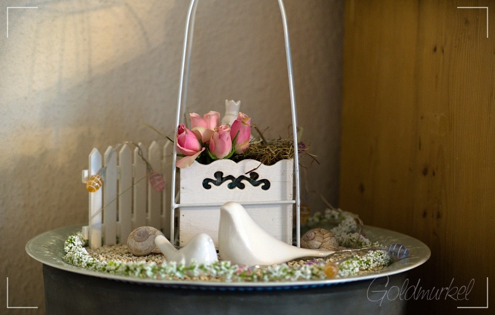 Das Holzkörbchen habe ich mal nach einem Einkauf aufgehoben, da waren, glaube ich, mal Pilze drin. Die Vase ist ein altes Marmeladenglas.
