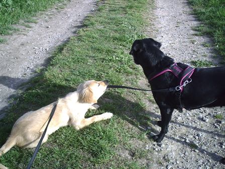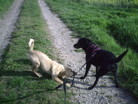 Auch wenn es auf dem Bild nicht so aussieht Mama, die Cosma ist schon echt ne Liebe. Frauchen sagt immer, dass sie schon eine ältere Dame ist und dass ich da nicht so ruppig sein darf wie bei Hannes. Aber manchmal, wenn ich gar nicht da mit rechne, dann spielt die Cosma doch mit mir… eben nur wenn sie will und nicht ich.