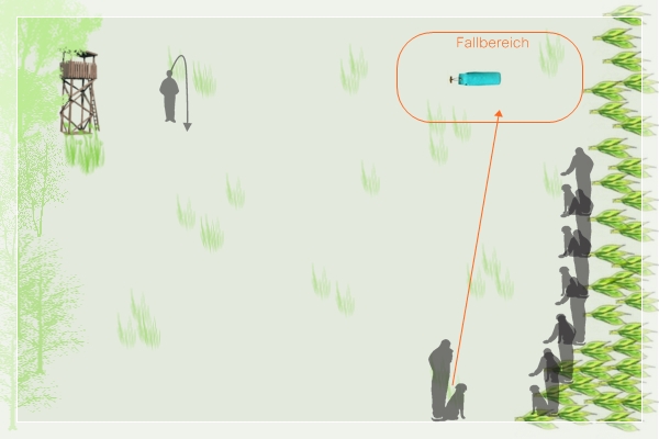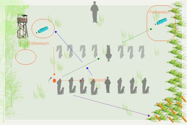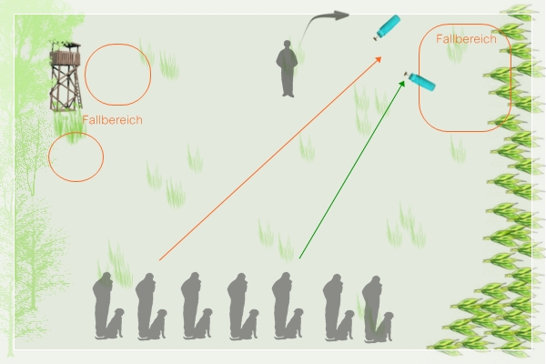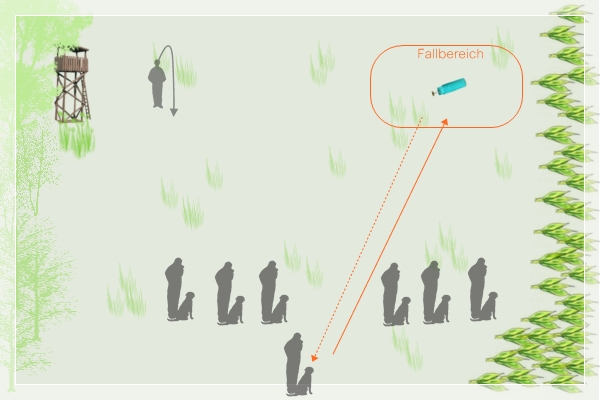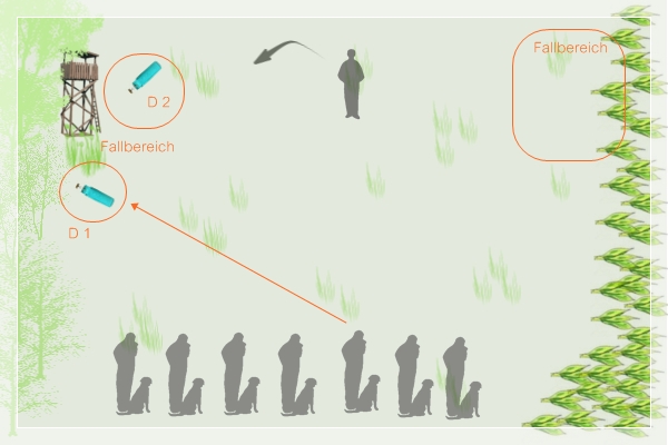 Diesmal steht die Linie im Hang parallel zum Maisfeld. Ein Team tritt aus der Linie, geht zum Startpunkt und die Markierung fällt. Dann muss der Hund an der Linie entlang arbeiten.