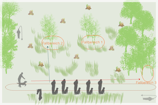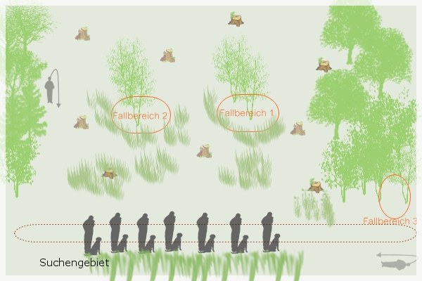 Team 1 steht auf dem Waldweg, die anderen Hunde in der Line. Als erstes fällt die Markierung in den Fallbereich 3 in etwas höheres Gras. Danach die Markierung in Fallbereich 2.