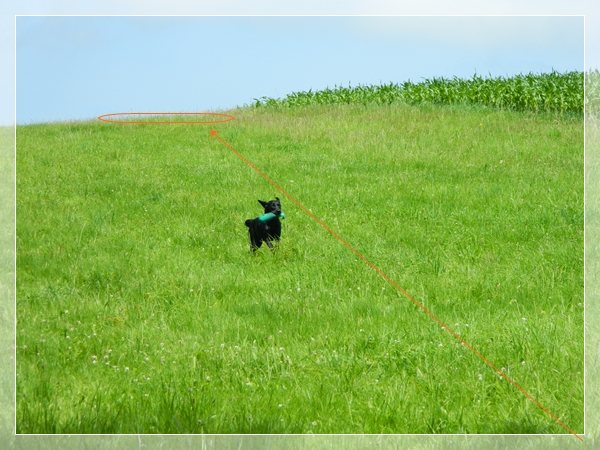 So sah es aus. Die Dummys fielen so, dass die Hunde über die Kuppe laufen mussten und teilweise kurz außer Sicht waren. Die Entfernung schätze ich auf 60 – 80 Meter. Im Fallbereich mussten die Hunde zwingen die Nase einsetzten denn sehen, konnte man das Dummy im Gras nicht.