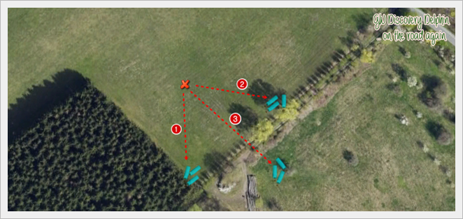 Wow, jetzt wurden Meter gemacht. Fiene und ich liefen gemeinsam den Weg (3) um die Dummys auszulegen. Durch den vorhandenen Bewuchs bin ich mir sicher, dass sie das Auslegen der anderen Dummys nicht gesehen hat.