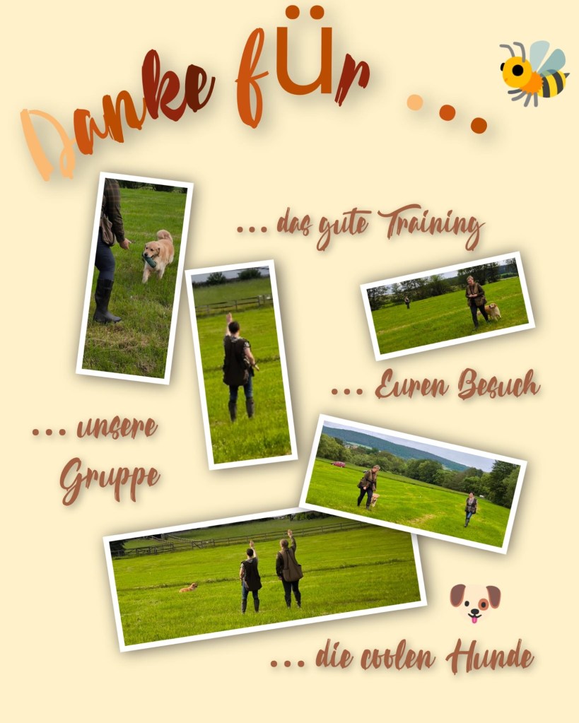 Am Donnerstag durfte er Hetty, Mac und mich zum Anfängertraining begleiten. Er durfte Jenny kennenlernen und mit ihr durch Doris Garten kullern. Später gab es ein paar Übungsminuten in einem völlig fremden Gelände und auch dort konnte er die Dinge, die wir üben gut abrufen.