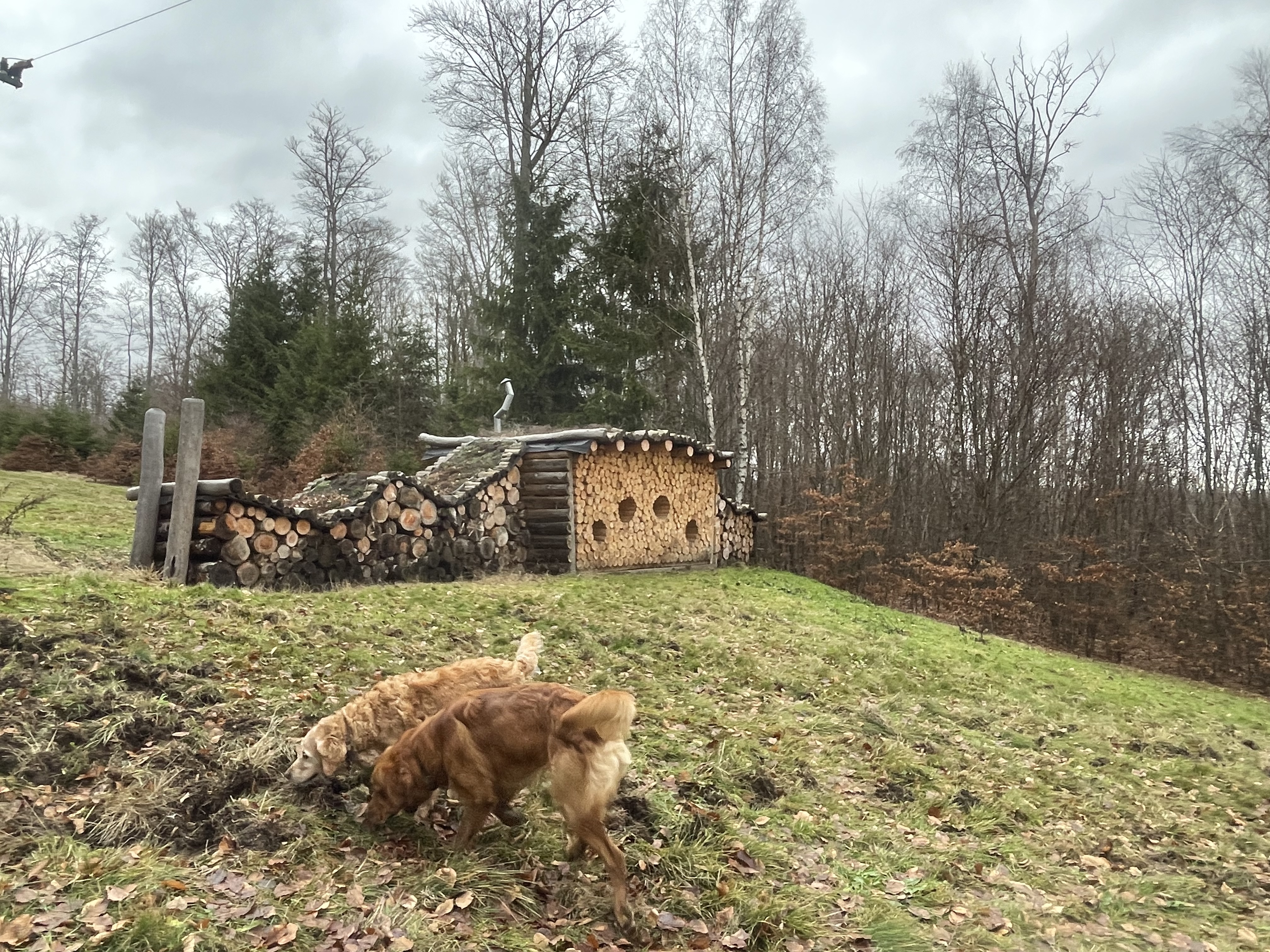 Heute Mittag haben wir eine richtig große Runde gedreht damit die Vierbeiner schön müde sind. Sieht dieses Häuschen nicht aus, wie von einem Hobbit? Dort kann man gut geschützt Rast machen.