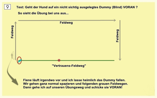 Dann ist es irgendwann soweit. Der Hund geht sicher, auch auf große Distanzen auf „seinem Weg“ auf halbblinde Dummys raus. Nun kommt der ultimative Test: