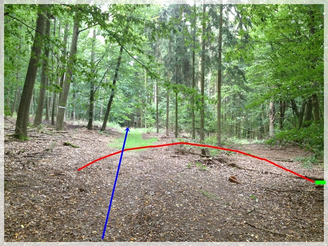 Ich werfe in einem Winkel ca. 70° eine Markierung neben die „Voranstrecke“.